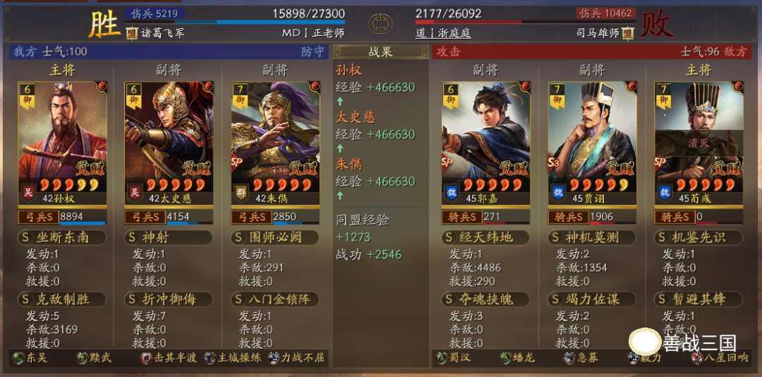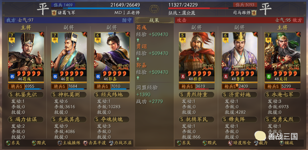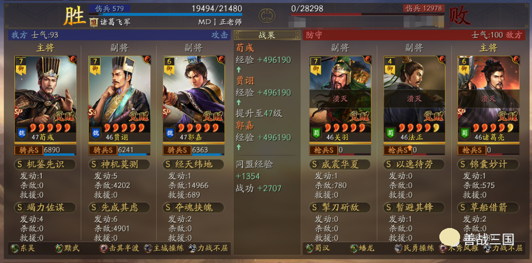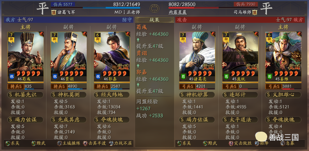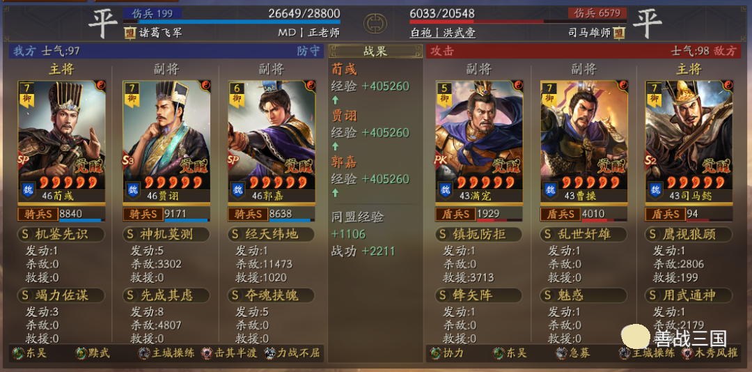 出队思路:龙虎里无论随到什么特性,只要有条件就可以无脑先出一队五谋;而黩武也能用在五谋里,我用的贾诩带先成临锋和郭嘉夺魂当锋,两个突击战法收益黩武效果,后5回合贾诩和郭嘉战法疯狂扔