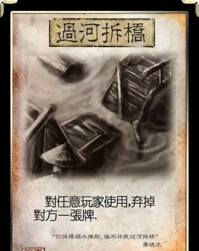 如果说【兵粮寸断】和【乐不思蜀】是一对双胞胎,那么【顺手牵羊】和【过河拆桥】也是。同样都是损耗敌人1张牌,【顺手牵羊】可以化为己用,而【过河拆桥】则是弃置。如果从收益方面看,【顺手牵羊】肯定比【过河拆桥】作用大,不过在实战中。敌人到了后期都会装备坐骑,没有距离的话,【顺手牵羊】无法使用,而【过河拆桥】则可以用。所以从适用范围看,【过河拆桥】比【顺手牵羊】强。