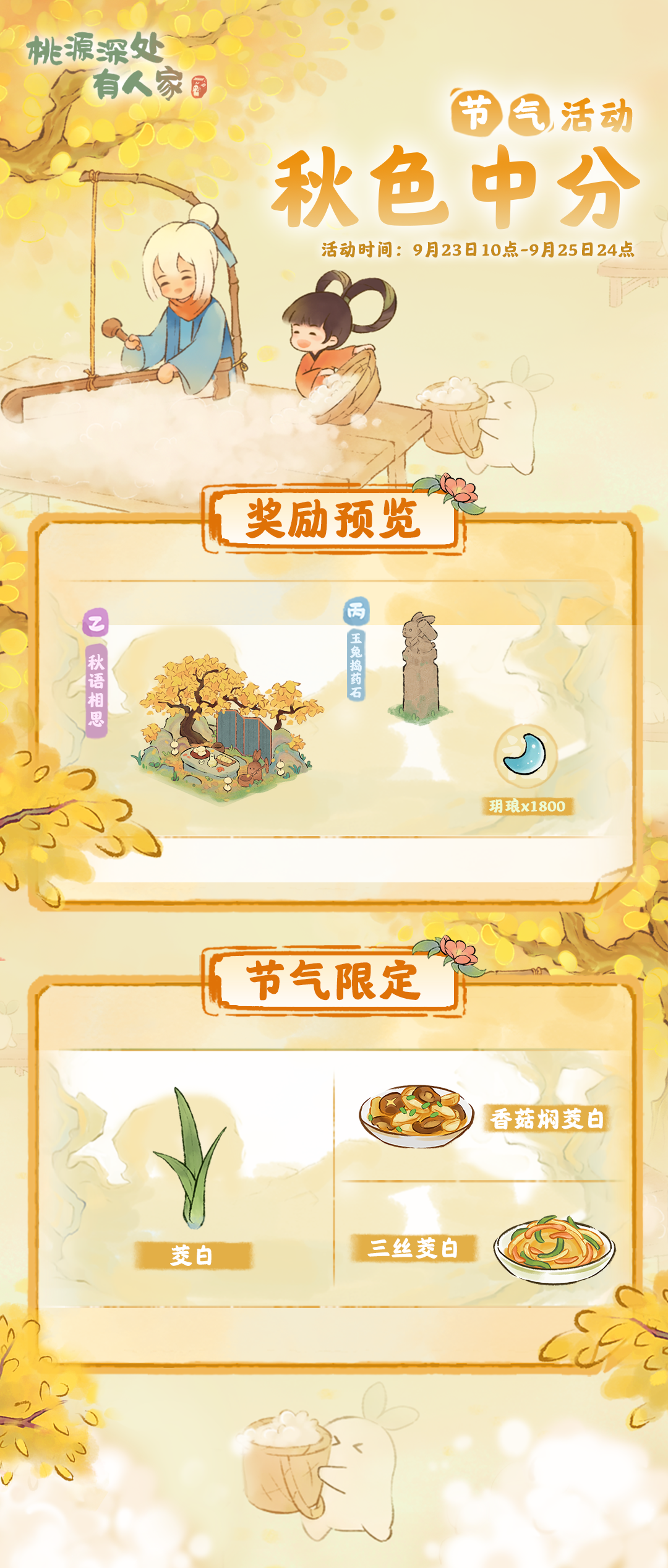 山民在活动期间内,可种植特殊农作物「茭白」和制作特殊节气菜肴「三丝茭白」「香菇焖茭白」,提交节气订单可以额外获得玥琅。萝萝山已准备好了本期的节气限定建筑,山民记得参与活动获取玥琅,不要错过兑换时间萝!