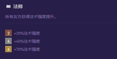 法师羁绊的效果是直接提供法强加成,6法师全员增加70%法术强度,相当于人均一个帽子,如果有【珠光莲花】,那么不用其他装备,伤害也直接拉满