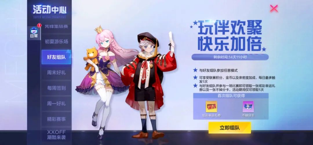 与好友组队享金币以及亲密度加成,还有不掉分卡以及炫彩幸运礼券等你来拿!