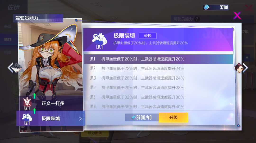 【极限装填】:机甲血量低于20%~35%时,主武器装填速度提升20%~40%