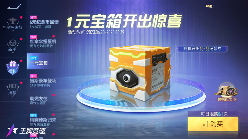 6月23日至29日,车手们还可购买1元宝箱,打开后将随机获得10至66纪念券,每日限购一次,邀你开启惊喜。