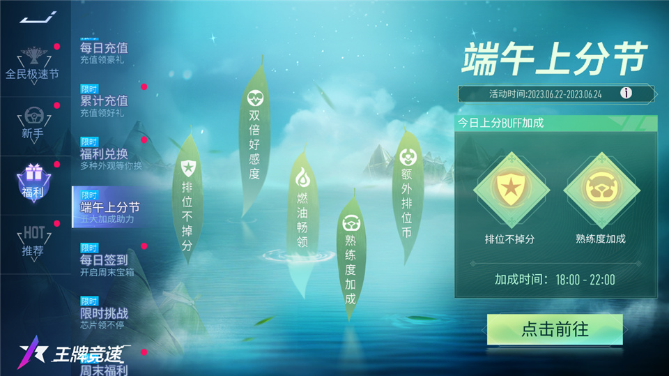 美好的假期,也是车手们迅速上分,提升段位的好机会!6月22日至24日,端午上分节将惊喜开启。此期间的每天18时至22时,车手们可随机享受排位不掉分、双倍好感度、燃油畅领、熟练度加成和额外排位币五重BUFF中的随机两项,倍增排位赛的收益和吸引力!