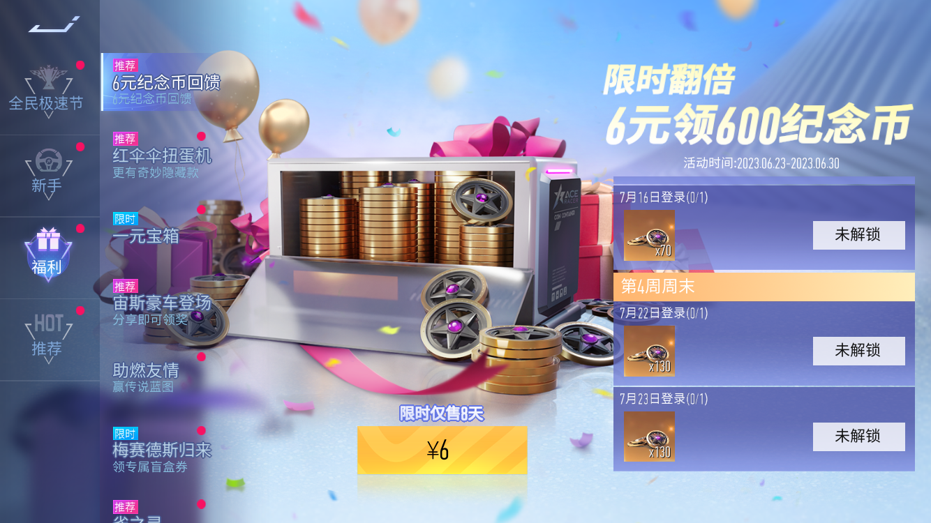 6月23日至30日,纪念币限时翻倍活动将惊喜登场!花费6元解锁活动特权后,车手们只需在之后的指定日期登录,便可获得纪念币返利,最高可得600纪念币,超高回馈倍数不容错过!