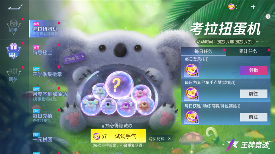 扭蛋机内的奖励是萌趣十足的考拉主题时装,共有7种不同的配色供车手们随机抽取,其中还包含一款神秘的隐藏款,最多只需6抽就能获得!