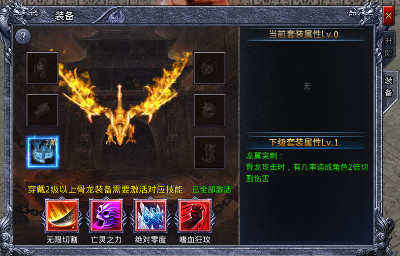 9.通过激活骨龙的技能可以增加骨龙的攻击力或人物的吸血,每个技能具有不同的效果,并能解锁不同等级的骨龙装备穿戴限制