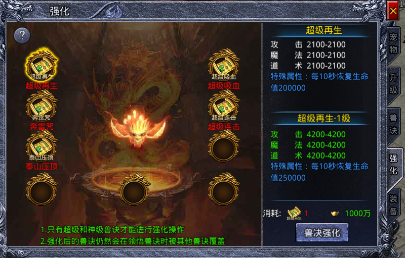 5、消耗同名的兽诀和元宝可以对兽诀(只有超级和神级兽诀才能进行强化)进行强化,提升基础属性和兽诀特殊属性