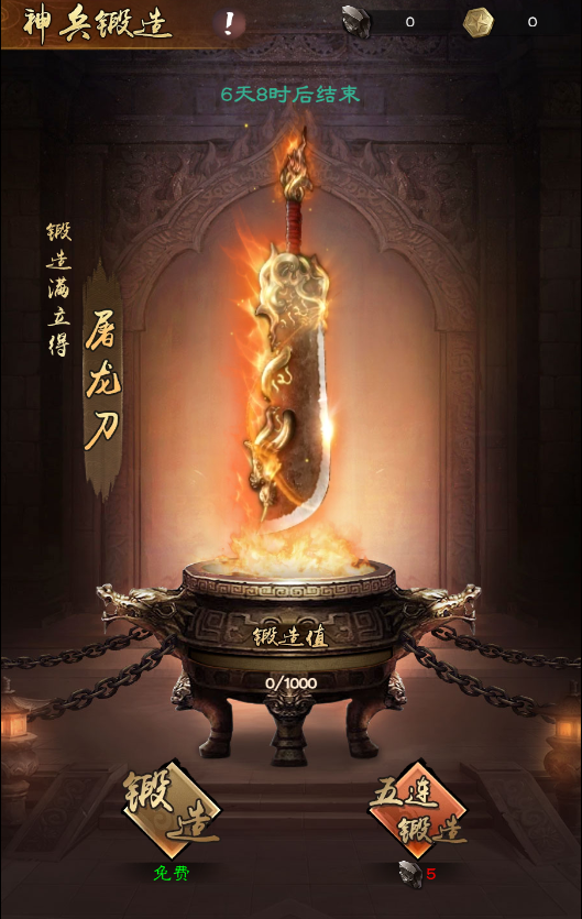 神兵锻造和神功现世活动分别先后进行,这里的活动对于零氪和微氪玩家,我建议不要去抽取任何神兵,完成每天的任务等待下一次该活动的到来,因为这两个活动,第一次是不可能拿到屠龙刀和龙爪手的,必须再次开启活动才可以。