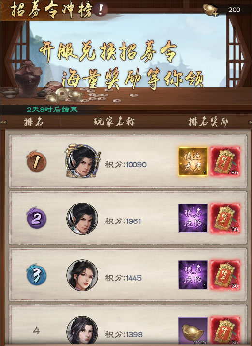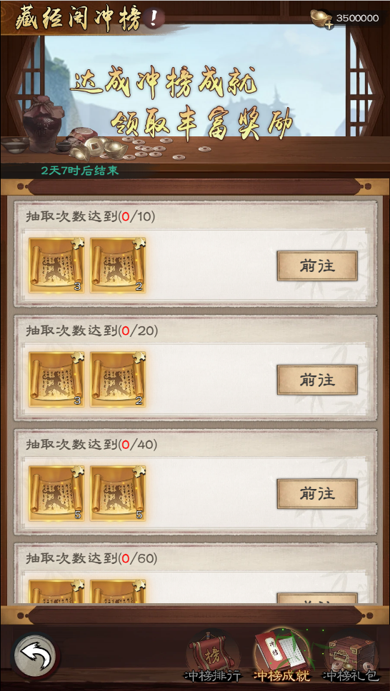 藏经阁活动也是三天,抽取藏经阁红书也是需要元宝抽取。我粗略算了一下,如果每天玩家只拉元宝,每天拉够六十次稳稳的(三个镖师),每次按平均值去计算四级元宝,也是四千八百元宝收益,再加上每天的活动、每日任务、游历等,一天下来也是万八千的元宝,在本次活动我们能够攒三万到四万元宝,即使零氪也能有三万元宝起步,所以最低也有一百抽。在这里我要特别强调的是,这里元宝不要留,提升战力很重要,体力和精力弄完后,剩下的钱一定要在本次活动投放所有元宝。