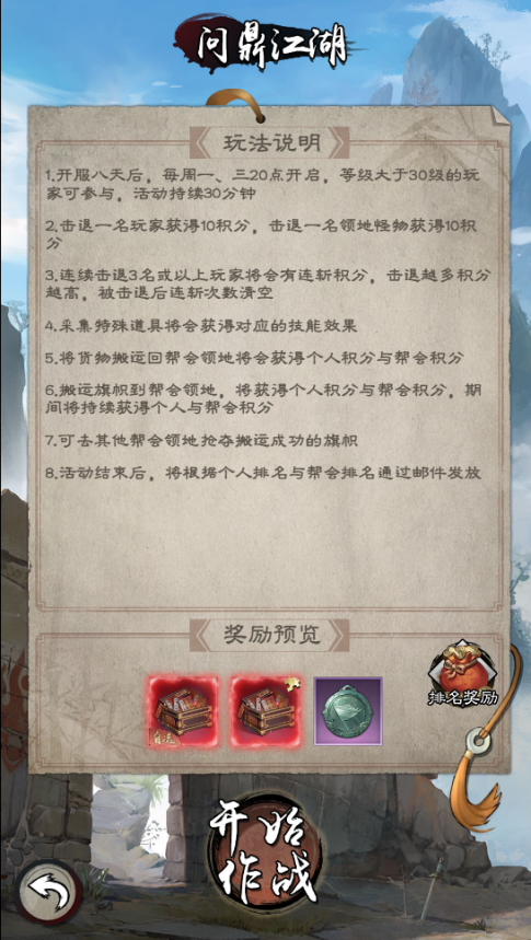 问鼎江湖包括资源运送、军旗抢夺、神秘武学收集及自由战斗,完成相应事件可获得积分。活动结束后,根据个人积分、帮会积分进行排名发放奖励(包括特殊红色功法宝箱、特殊红色功法碎片、帮会贡献等奖励);