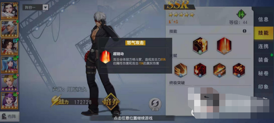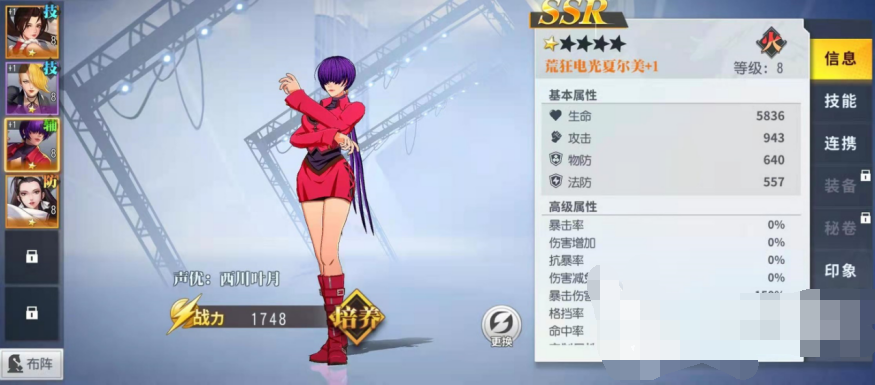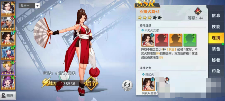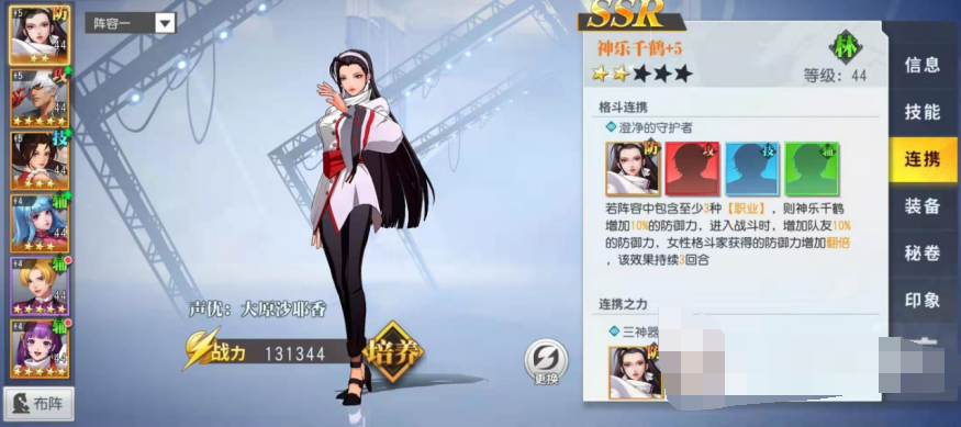 在目前的游戏中,大家最常用的角色莫过于不知火舞,库拉,神乐千鹤,八神庵,K神,疯狂电光夏尔美,草薙京,麻宫雅典娜等。神乐千鹤是初始SSR级别的格斗家,也是前排最坚固的肉盾。自身的被动解锁之后,可以为同一排的队友附加一次减免伤害和增加抗暴击率的效果。这样就将我们的前排坦度上升了一个档次,而且自身的大招还可以对敌方全体造成沉默效果,对于团队的辅助能力也非常强。