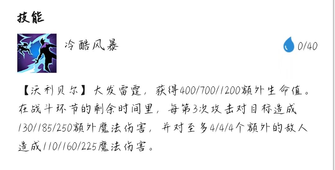 【沃利贝尔】大发雷霆,获得400/700/1200额外生命值。在战斗环节的剩余时间里,每第3次攻击对目标造成130/185/250额外魔法伤害,并对至多4/4/4个额外的敌人造成110/160/225魔法伤害。