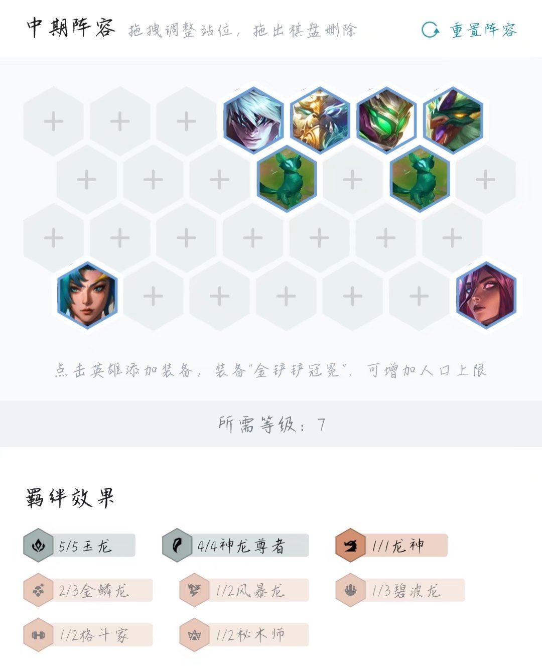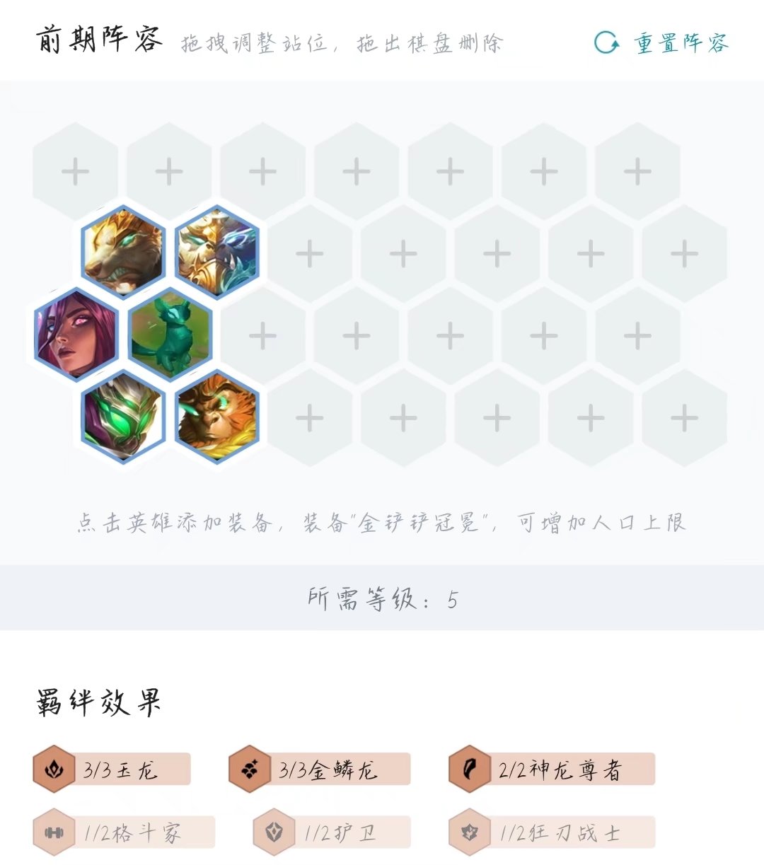 开出5玉龙4神龙1龙神,此时看自身血量,如果健康的话,就可以慢上8,不然的话需要选择是d出二星石傲玉稳血,还是直接冲上8级。我们要追三星狗熊,但是不选择在7级d,因为7级找到5费卡的概率只有1%,8级有4%,还能顺带追追石傲玉。最后追出狗熊完成阵容构建。