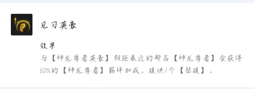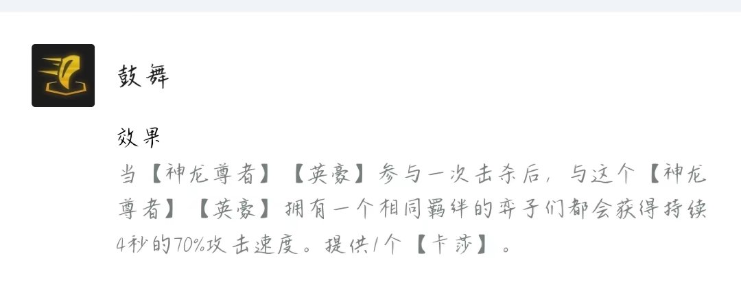 效果为当【神龙尊者】【英豪】参与一次击杀后,与这个【神龙尊者】【英豪】拥有一个相同羁绊的弈子们都会获得持续4秒的70%攻击速度。提供1个【卡莎】。