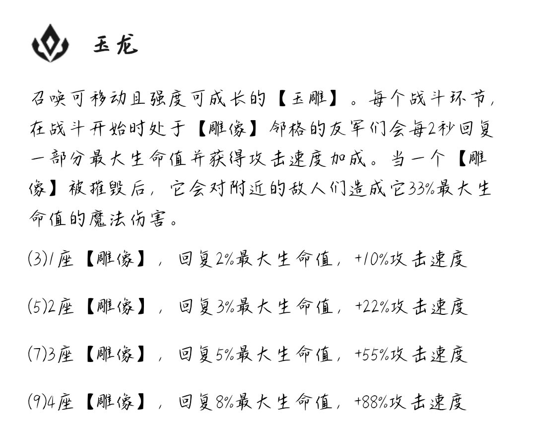 召唤可移动且强度可成长的【玉雕】。每个战斗环节,在战斗开始时处于【雕像】邻格的友军们会每2秒回复一部分最大生命值并获得攻击速度加成。当一个【雕像】被摧毁后,它会对附近的敌人们造成它33%最大生命值的魔法伤害。