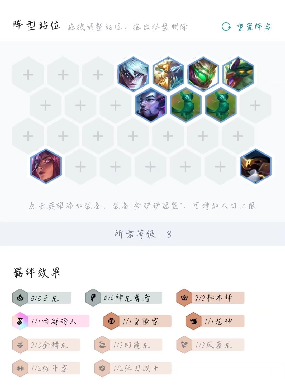 本阵容由主C狗熊,卡尔玛,贾克斯,盲僧,石傲玉,亚索和巴德组成,八人口成型,开出5玉龙4神龙2秘术1吟游诗人1冒险1龙神,上九后挂两星奶妈补充质量即可。