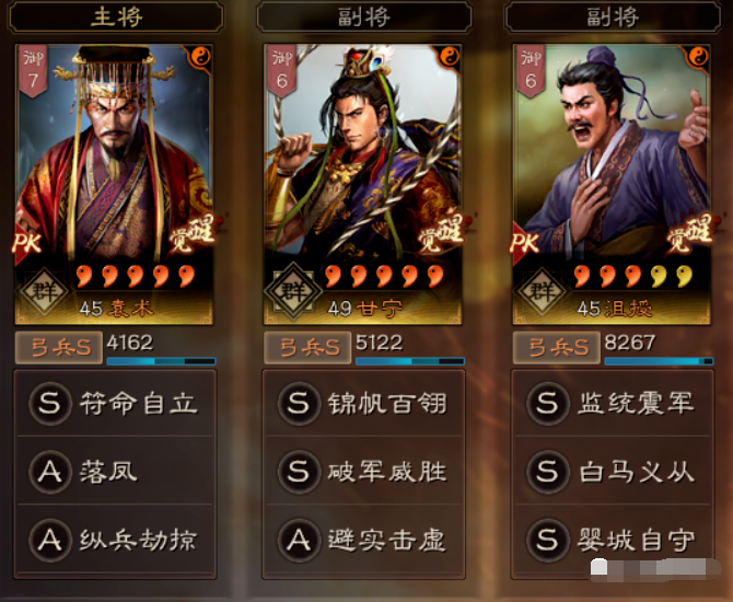 以上两个搭配都可以的。这个队伍有很强的适应性,同时吃的技能基本和其他主流队冲突不厉害,S1-S6通用,非常的万金油。甘宁,程普属于偏好抽的武将,很多小伙伴都有,比起孙尚香,孙权等武将普及度高。甘宁+万箭齐发属于大力出奇迹的组合,发挥好以弱胜强不是梦,有创造奇迹的可能。注意调整太史慈的速度,保证太史慈是队伍的1速出手。