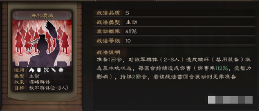 说到这支蜀智能够打出精彩的表现,决水的表现确实可圈可点,准备1回合,对敌军群体造成禁用装备以及水攻的状态,每回合持续造成112%的伤害,持续2回合,并且该战法首回合发动则无需准备。