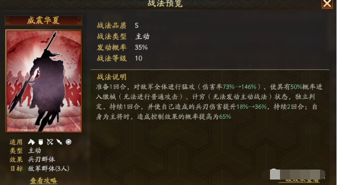 提升自身兵刃伤害36%。主将位置控制概率增加到65%。当然缺点也十分的明显,