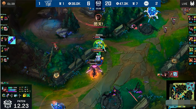 团战收获大量人头的阿卡丽成功接管边路,非常轻松地对位单杀辛德拉,同时厄斐琉斯在推进中路一塔的过程中连招将卡莉斯塔秒掉,随后EDG放出先锋直接推进中路高地,又将站位不慎的岩雀先手秒杀。MOJ全线溃败节奏全无,根本找不到任何突破的角度。20分钟刚到EDG直接开始大龙逼团,MOJ刚刚靠近河道就遭到迎头痛击,EDG摧枯拉朽0换4团灭MOJ以后不费吹灰之力拿下大龙Buff,手握超过一万块的经济领先,比赛已经基本失去悬念。