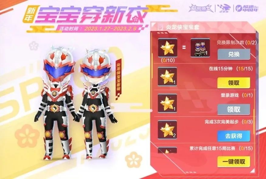 新年换新装!可爱的宝宝当然也有啦~即日起-2月9日,车手们完成指定任务,即可获得铠甲之心,收集10个铠甲之心,即可兑换炎龙侠宝宝套装礼盒!车手们快去收集道具兑换奖励吧~