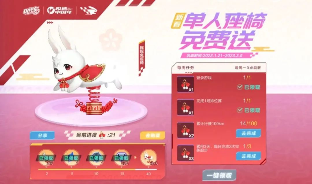 即日起-3月5日,春节限定单人座椅摇摇兔免费送!车手们完成指定任务即可领取摇摇铃铛,累计收集摇摇铃铛达到一定数量,即可领取进度奖励!累计获得40个摇摇铃铛即可兑换摇摇兔单人座椅(永久)!