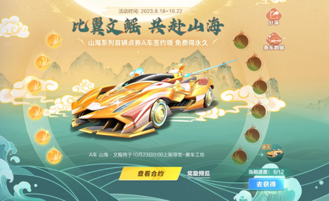 比翼文鳐,共赴山海!即日起-10月22日,车手们登录游戏进入活动页面即可签订合约,完成指定任务即可积累进度将永久A车山海·文鳐带回家~