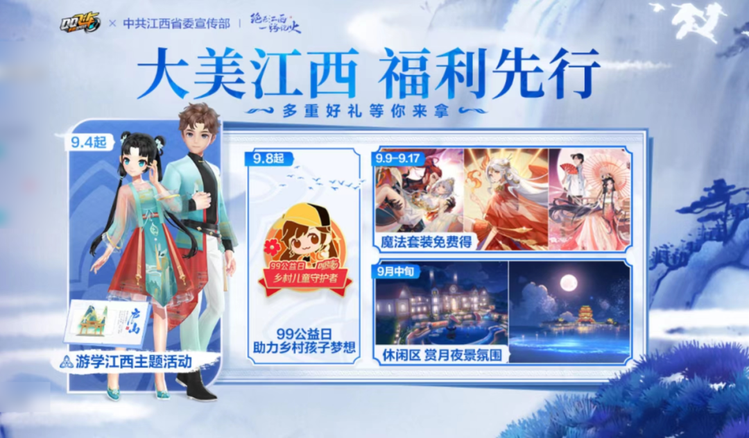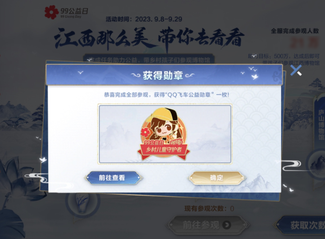 江西那么美,带你去看看~99公益日×江西文创活动来袭!9月8日-9月29日,车手们登录游戏并完成指定任务可获得参观次数,点击【前往参观】即可参观江西的博物馆,完成全部5个博物馆的参观后可获得“QQ飞车公益勋章”!