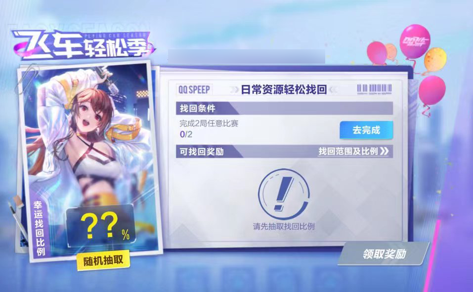即日起-10月15日,车手们可以在每个周末参与飞车轻松季-日常资源轻松找回活动,抽取幸运找回比例,完成幸运任务后,即可按照幸运找回比例领取当周内未领取的任务奖励,如经验、金币、点券和部分道具~