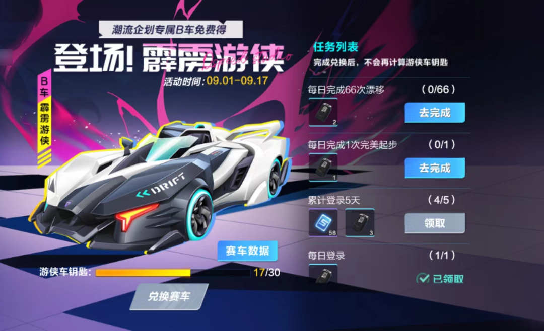 即日起-9月17日,车手们登录游戏并完成指定任务即可获得游侠车钥匙,获得30个游侠车钥匙即可兑换潮流企划专属B车-霹雳游侠!