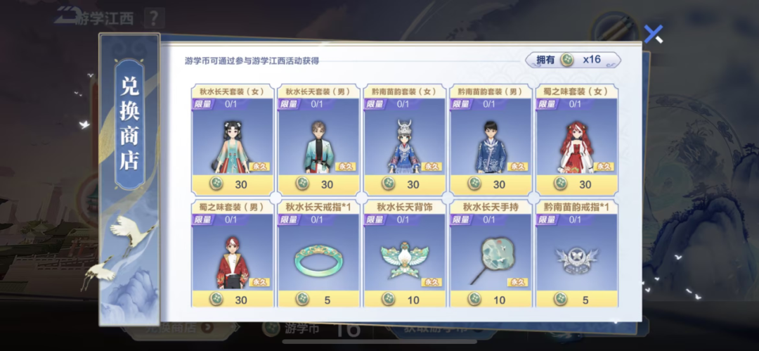 车手们在不同的玩法中均可获得游学币,积累一定数量的游学币即可在兑换商店中兑换秋水长天套装等丰厚奖励!车手们快去完成任务获取游学币吧~