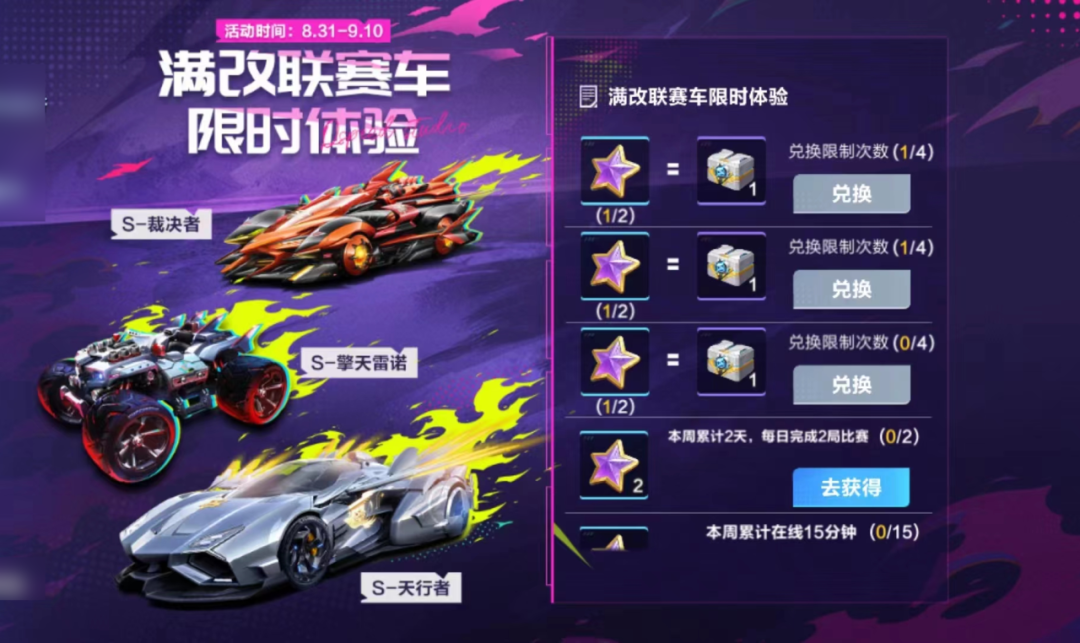 即日起-9月10日,车手们登录游戏并完成指定任务,即可在S-天行者、S-裁决者、S-擎天雷诺中任选其一,获得限时满改体验~