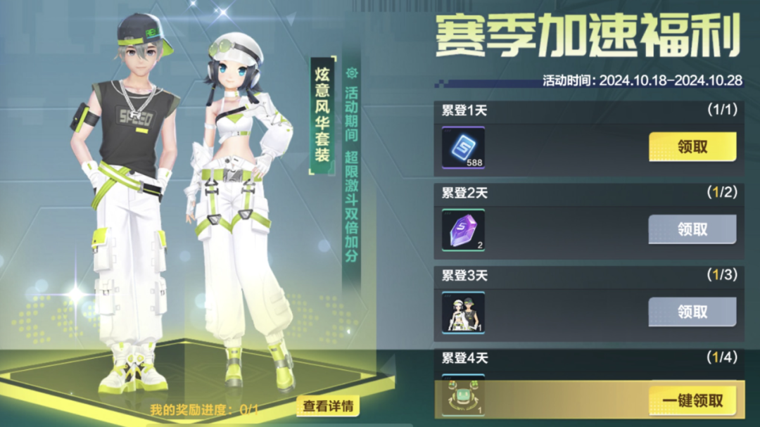 全新版本即将上线!新版本预热开启~10月18日-10月28日,车手们完成累登任务即可领取双性别炫意风华套装(永久)及戒指、排位保护卡等奖励~ 同时,在活动期间,车手们参与超限激斗模式还将获得双倍积分奖励哦~助力车手们轻松上分!
