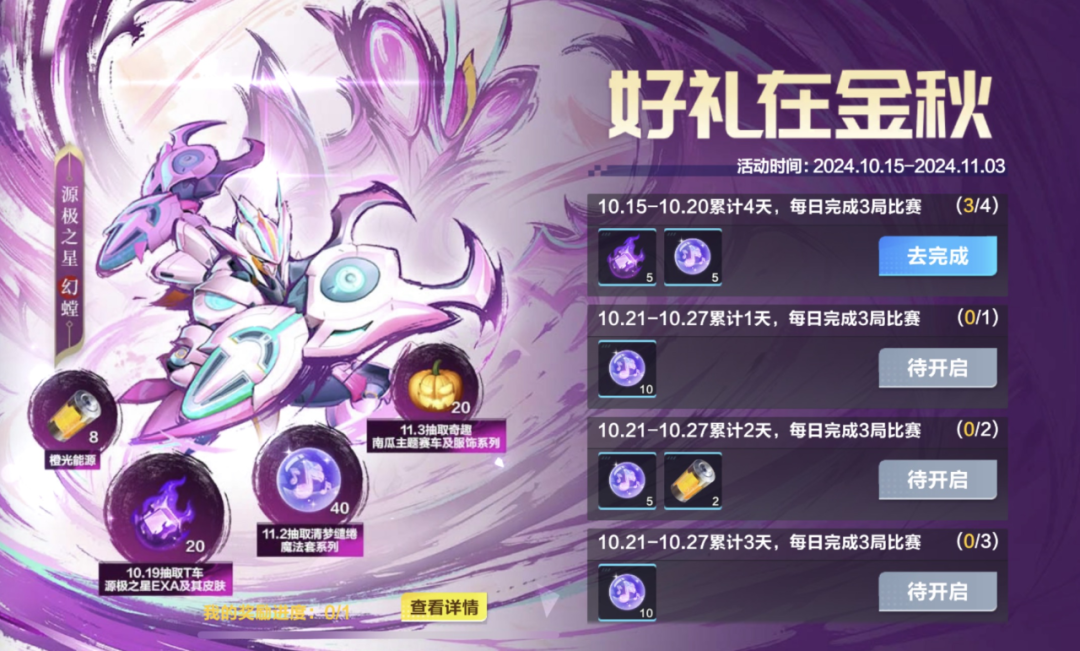 金秋送礼,超多钻石抽奖道具免费送!10月15日-11月3日,车手们登录游戏并完成指定对局任务,即可获得橙光能源*8、源极之星专属机甲源石*20、清梦缱绻专属水晶球*40、奇趣南瓜专属祈愿卡*20!更多活动详情车手们可点击下方图片查看哦~