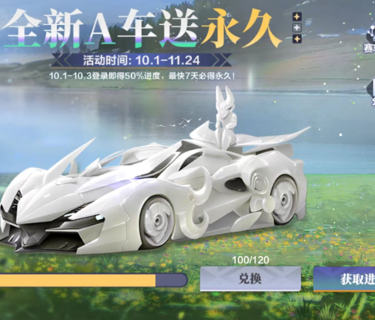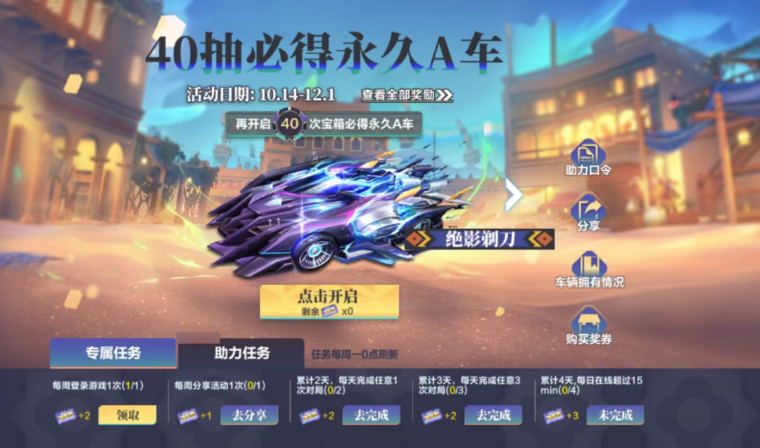 10月14日-12月1日,40抽必得永久A车活动现已重磅开启!车手们在活动期间完成指定任务即可获取抽奖券,使用抽奖券累计开启宝箱40次随机必得绝影剃刀、天狼星、劲霸、暗耀武神等15辆永久A车之一!快来领取你的A车吧~