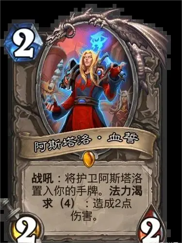 战吼:将护卫阿斯塔洛置入你的手牌。法力渴求(4):造成2点伤害。