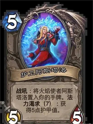 战吼:将火焰使者阿斯塔洛置入你的手牌。法力渴求(7):获得5点护甲值。