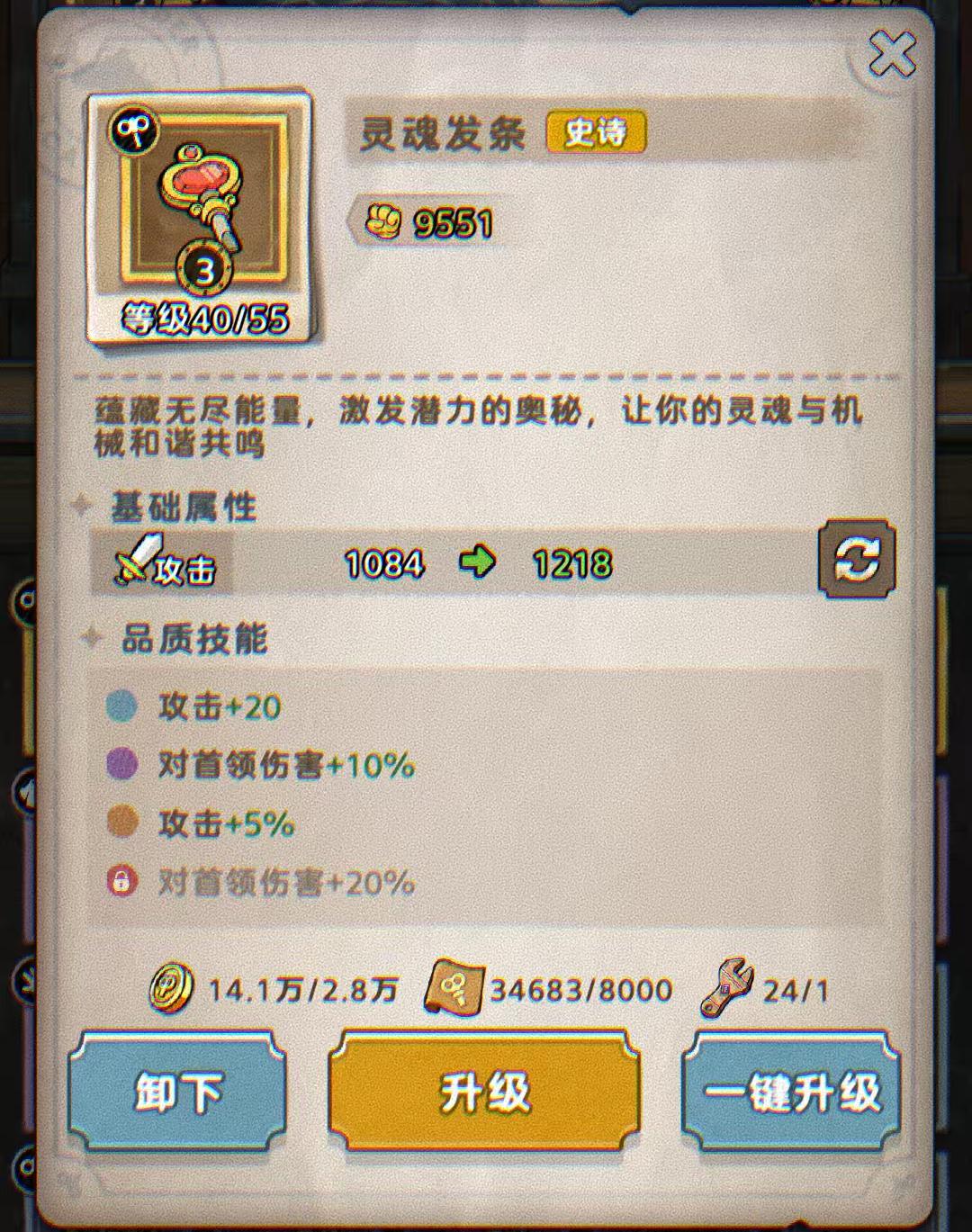 升级: 进阶后的装备还能消耗金币和对应部位的图纸进行升级,进一步提升属性。图纸主要在基础战役和特定副本(比如“气球派对”)产出。针对性刷图效率更高!