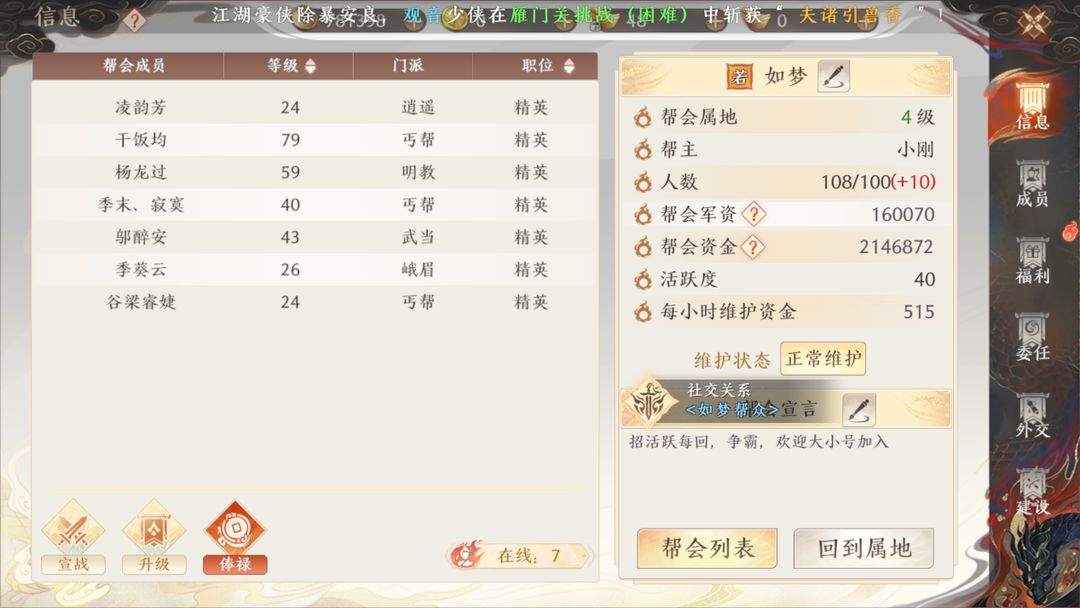 6、帮会外交帮主和副帮主,可以确认自己帮会与其他帮会的关系,无需对方同意,最多可以设置5个宿敌。