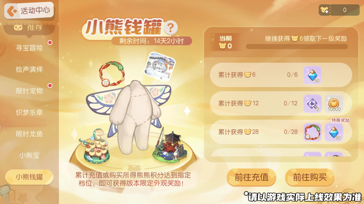 活动介绍:小熊钱罐限时回馈活动上新,在活动期间,每往游戏内充值1元,即可获得1点小熊积分。当小熊积分达到对应的奖励积分档位时,可解锁对应的进度奖所,丰厚的奖励包括晨星互动家具「蛇恋花灯」「莲池飞仙」,限定称号「仙熊奇侠传」、头像框「风华影视城」、翅膀「燕翅纸鸢」、背景卡「红梅映瑞雪背景」等,快来参与吧!