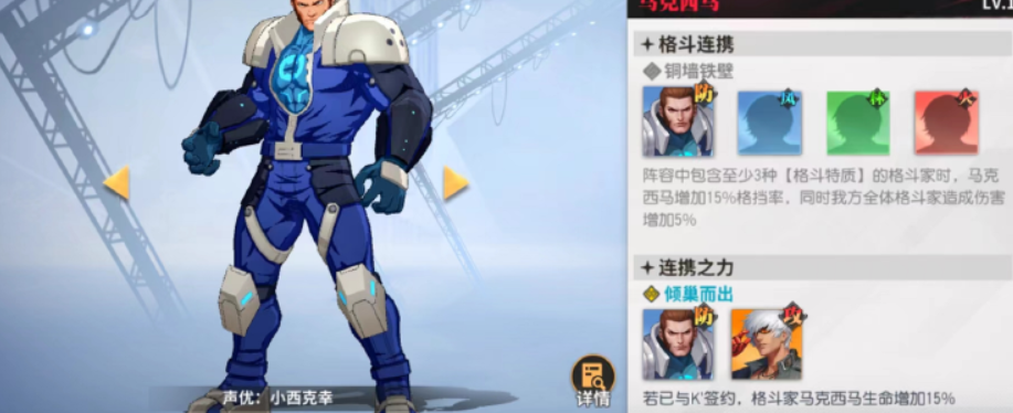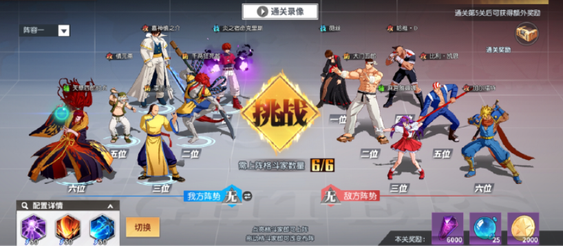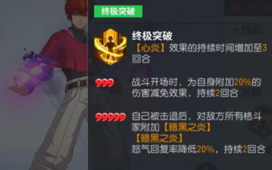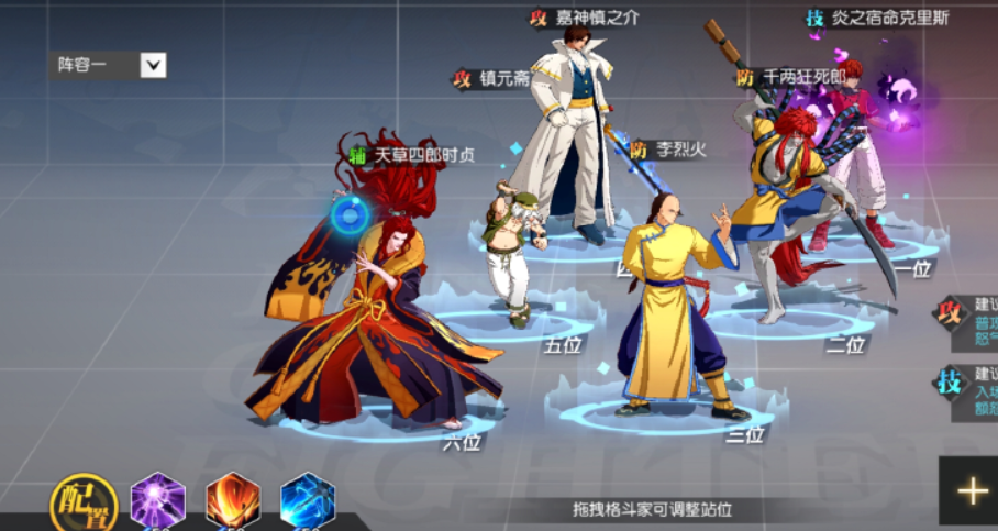 这里推荐优先养成草薙京,易获取,强度还不错,后面抽到SSR角色,嘉神慎之介、天草四郎时贞,也可逐步替换,围绕“引爆”、“高概率上火”等角色特性,调整队伍其他格斗家,慢慢晋阶。