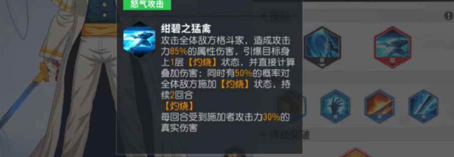 配队方面,因为【灼烧】效果为:每回合受到攻击者30%攻击力的真实伤害,所以灼烧队并不害怕打持久战,加上本身增益buff偏向输出,攻势很猛,组成成员偏输出,那伤害会很高。而火队成员不齐全的情况下,灼烧队也可通过搭配高防御角色,打消耗战,前提是需要一个核心输出角色,将灼烧所带来的真实伤害收益最大化。
