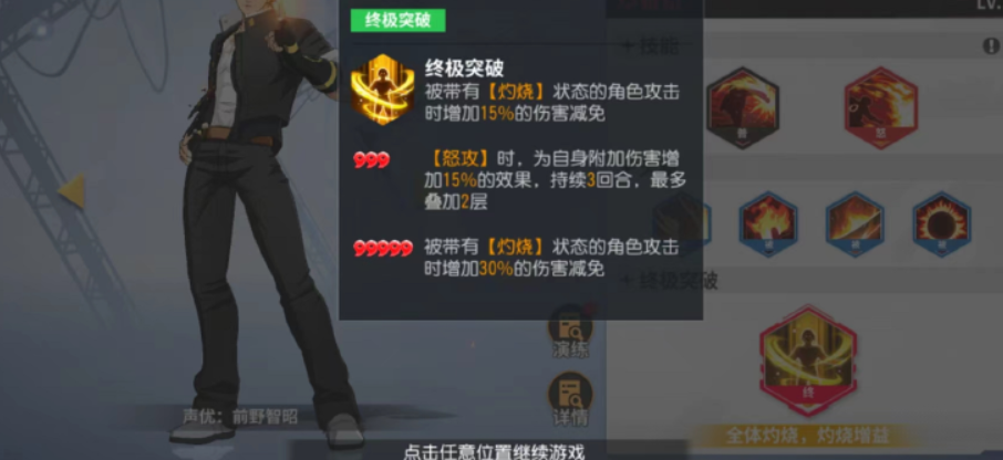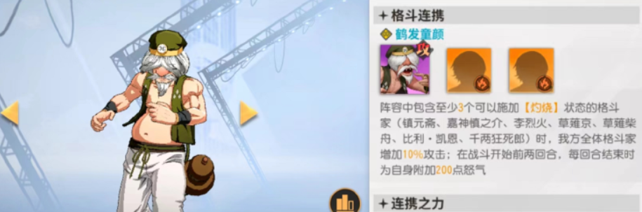 队伍中如果只有单一灼烧角色练度高(如:草薙京),推荐搭配李烈火、天草四郎时贞、马克西马等具备防御或回复能力的格斗家,通过持久战消耗,击败敌人。适合pve,打一些高强Boss,拉锯时间。