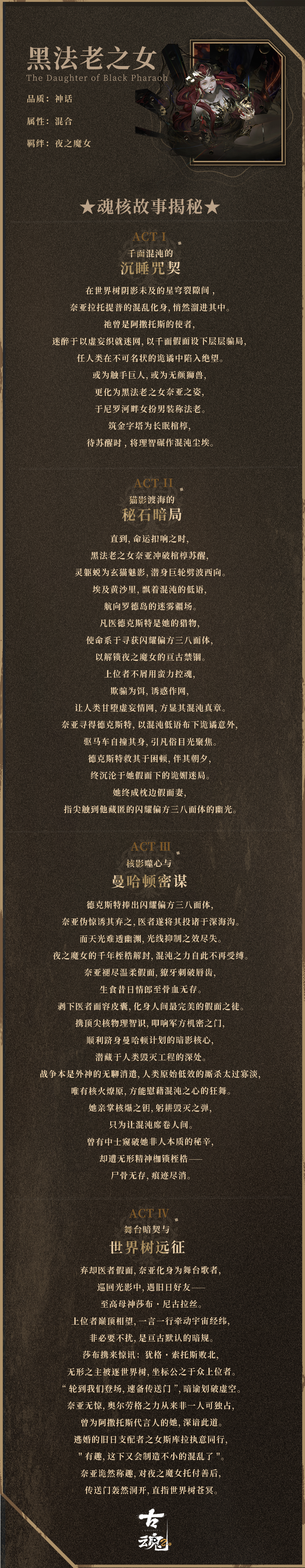 奈亚作为奈亚拉托提普混乱面的化身,曾以戴金色法老面具、女扮男装的女法老身份统治古埃及并建造第一座金字塔长眠,数千年后被唤醒,其本质爱欺骗诱惑人类陷入绝望。神话魂核——「黑法老之女」专属召唤池上线,只需祭出永恒之力,便有机会获取黑法老之女的力量。