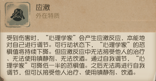而“心理学家”的【应激】在受到伤害后,恐惧值会持续下降,即使期间受到伤害,效果也不会被打断,因此“心理学家”在牵制的过程中可以承受更多的伤害,但在应激反应中无法接受任何效果的治疗,例如使用镇静剂、饮酒等,【应激】效果消失后将无法进行自我调节,但可以接受他人的治疗。