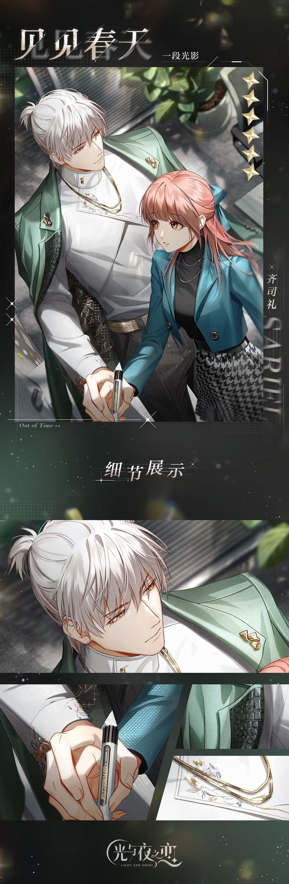 [6星]灵犀 齐司礼・见见春天 对应灵犀剧情为全新【胶片】剧情玩法,4月29日 05:00起光夜变奏Ⅱ・新生乐章第一章开放后可体验。畴昔往事如云烟,在光与影的交错之间,唤回那逝去的某年某月某天。
