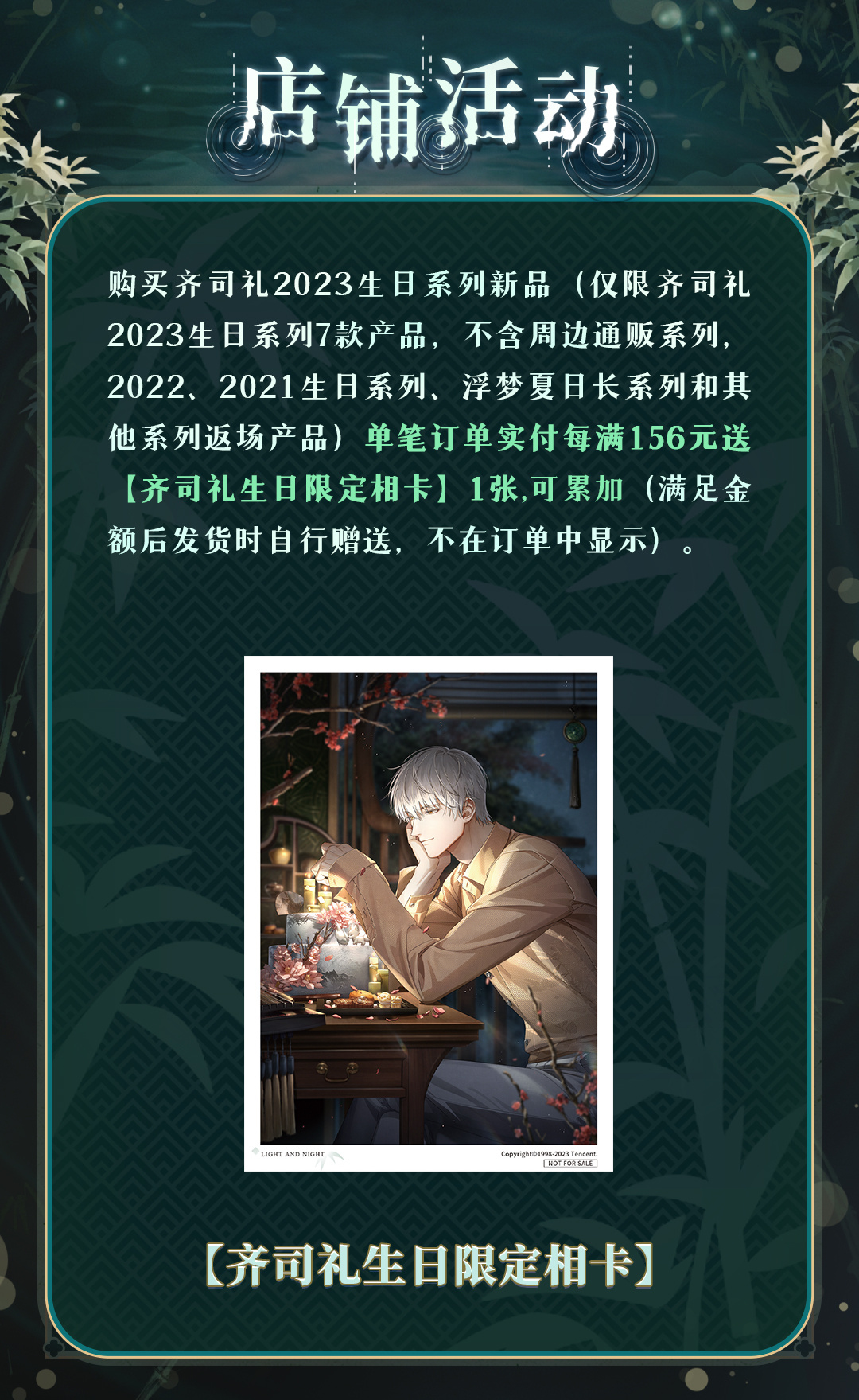 ◆ 购买齐司礼2023生日系列新品(仅限齐司礼2023生日系列七款产品,不含浮梦夏日长、周边通贩、2022生日、2021生日返场和现货返场等系列产品)单笔订单实付每满156元送【齐司礼生日限定相卡】1张,可累加(满足金额后发货时自行赠送,不在订单中显示)。