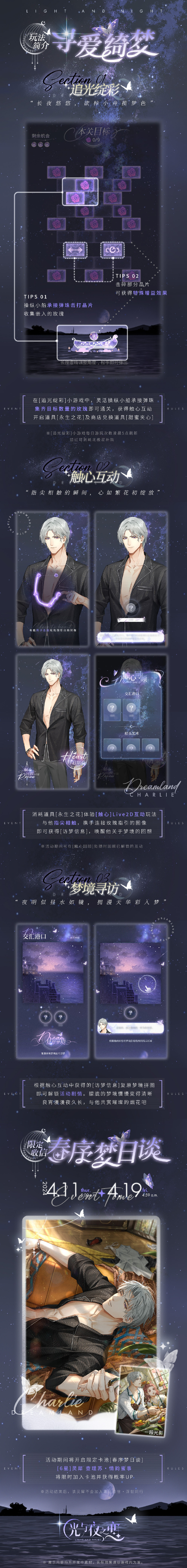 活动说明:韶光密语,怦然而动。流光熠熠,将梦的边陲照亮……参与活动即可体验专属剧情,获得活动限定 [3星]灵犀 查理苏·春意予你、朋友圈封面、专属头像框、登录语音等奖励。