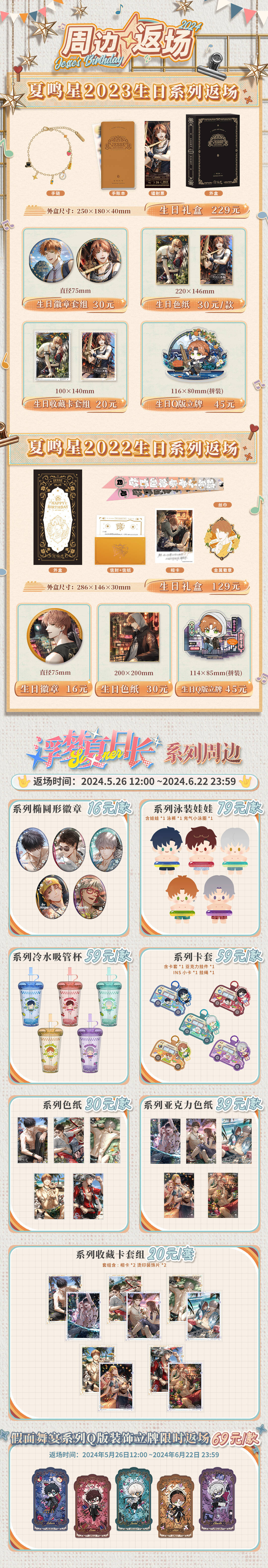 夏鸣星2024生日限时周边新品、夏鸣星2023生日、2022生日系列、浮梦夏日长系列和假面舞宴Q版装饰立牌现货返场将于5月26日12:00正式开售。